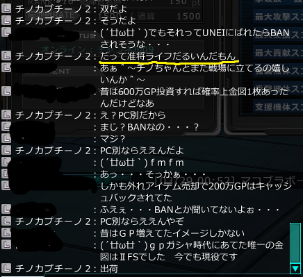不明 「赤かぷち」がS連キャラだと晒されたが戦闘履歴のプレイ時間が被っており別人だと思われる (しかしこの「赤かぷち」もチノカプチーノと同レベルの戦犯代理を行っている)