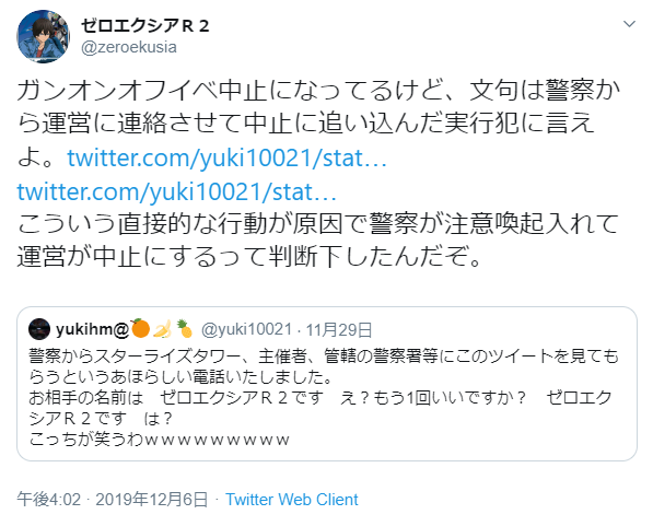 2019年12月06日、運営が犯罪をほのめかす投稿を確認したと同時に警察から連絡をいただいたとして2019年12月15日に予定していた オフラインイベント(ガンオン宣伝部Mk-II〜BEYOND THE 7th ANNIVERSARY〜)の中止を発表。 キタノなりすましによるアカウントBAN後もツイッターにて淡々とヘイトを集める呟きを続けていたゼロエクシアだが 犯罪をほのめかす呟きをした張本人として話題となった。 事の発端はイベント中止発表の1か月半前に投稿された呟きによるものだった。 10月の呟きの時点ではまだオフイベのお知らせはきていなかったのだが、 一部のガンオン勢の中で改めてこいつヤベー奴だなと再認識されていた。 しかし、その3日後、なんと公式生放送で運営がオフイベの開催を発表した。タイミング最悪である。 これを聞きつけた一部ツイッターユーザーは例のツイートを掘り起こし本人を煽り立てるように拡散。 だが恐らく本人も引くに引けなくなったのかツイートの削除や発言の撤回は行わなかった。 この呟きの時点で通報されてもおかしくないはずなのだが、 何を思ったのか今度はその1か月後に直接オフイベの名前を出した 爆破予告とも受け取れるような呟きを投稿してしまう。(馬鹿なのだろうか) その約1時間後にはあるガンオンプレイヤーが流石にそろそろ危ないのではないのかと感じ、警察に通報している。 通報の際相手の名前を聞かれたが、本名がわからないため、仕方なく彼のユーザーネームである「ゼロエクシアR2」というクッソダサい名前を警察に伝える羽目となってしまった。 その後も警察と彼のツイートを一緒に見ていったそうで二人して笑っていたとかなんとか。 一応通報した当日には警察に実害ありと判断されていたのだが、しばらくの間は特に運営からの報告もなくメンテナンスも通常通り行われていた。 もちろんその間もじわじわとツイートは伸び続け、多くのユーザーに彼の存在が知れ渡り始めていた。 そしてその丁度1週間後、運営によってイベントの中止が発表され事態は急展開を迎えた。 お知らせを見たユーザーの反応はまちまちであり、純粋にイベント中止を悲しむ者もいれば面白がって悪乗りをする者もいた。 過去に死傷事件を起こしていることもあってか、複数のまとめサイトなどで記事を作成されてしまい、悪い意味で話題となってしまった。 (現在「ガンダムオンライン イベント中止」で検索すれば実際にまとめられている記事を見ることが可能) 本人は用事があったのか寝ていたのか中止が発表されてから約5時間後にようやく騒動に気づき呟きを投稿した。 その呟きがこちら 通報した人(彼によれば実行犯)が悪い、そいつが通報したせいで中止になったんだから文句は通報した奴に言ってくれとのこと。 どうしたらこのような考え方に行き着くのか不思議でしょうがない。 ここで発言の撤回やらをして誤解を招くような発言してしまったことお詫びするべきなのだが、プライドが高いのか単純に頭が悪すぎるのか彼は一切自分の非を認めるような呟きはしなかった。 恐らく本人はイベント中止の原因となったツイートについては完全にネタであり、それを信じて通報した馬鹿がいる程度にしか思っていないようでその後も強気な呟きをしたり、自分のせいであるにもかかわらず参加者が可哀そうだなどというわけのわからないツイートをしている。 ツイートを見るに恐らくこんなことで逮捕されるわけがないと思っているのだろうが、 自分ではネタや冗談のつもりであっても「人や建物に危害を加えるつもりだ」といった暴力的な表現を用いて業務を妨害すれば、威力業務妨害罪という立派な犯罪となる。