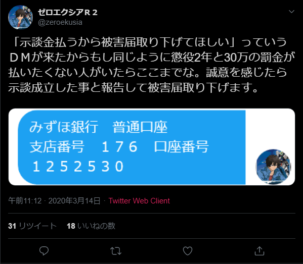 時々彼だけではなく彼を通報した人物も悪いとの書き込みが見受けられるが、それは間違いである。 確かに彼が通報しなければこのままオフイベが開かれていた可能性があるが、事件が起こる可能性が0であったとは限らない。 また、ゼロエクシアが爆発するつもりがなかったとしても不安を煽るような脅迫をしたことは事実であり、十分通報するに値する行為である。 結局のところ警察に通報し、警察が脅迫であると判断したのだから、文句を言うならどちらかといえば警察に言うべき。 また、彼は中止が発表された当日に以下のような投稿を行っている。 ・通報はもし事が起きてからあの時してればよかったってなるのが嫌だった ・当選者の皆様へ、今回俺の行動から中止になった事本当に申し訳ない 一応画像ロダ、雑談版、ツイッターを見る限り、通報したのは彼だけではない模様。