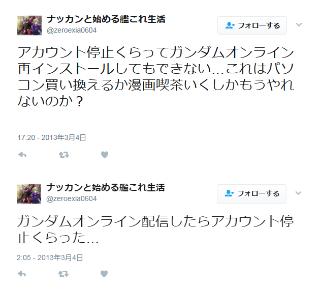 ツイッターで突如ガンダムオンラインキャラ削除企画を始め、 本人が想定していたかしていなかったかは不明だが100RT以上集まってしまったため生放送を通してキャラ削除をしている。 しかしツイッターでは未だにガンダムオンラインについての呟きを未だにしており、相当な未練がある事が伺われる。 既にアレクナポレオンというキャラで復帰している疑惑がかけられており、 指摘された途端このキャラを削除したため現在は別のキャラで活動している可能性が高い。 本人いわく「指揮はもうしない」とのことだが、これも嘘の可能性が高いためそれらしいキャラが指揮に入った場合警戒した方がいいだろう。 というかキャラ一覧にあるように、削除後に既に2アカウントも作っている上に、暴言や指揮を続けているのが現状である。