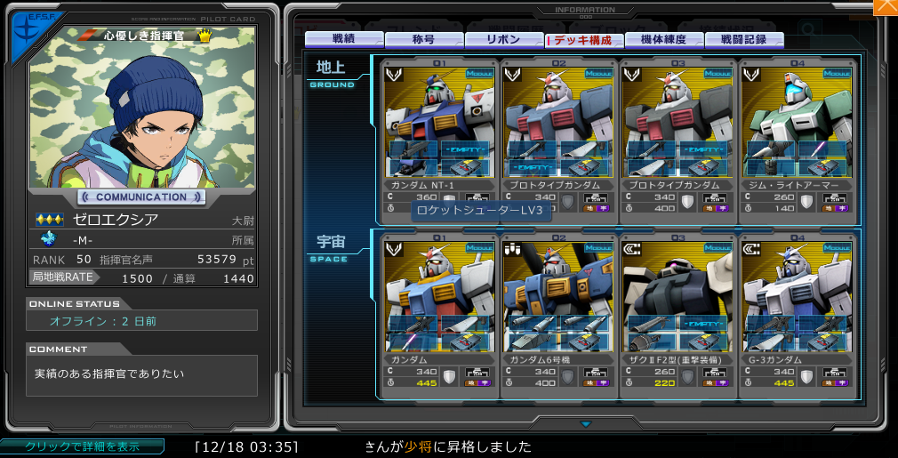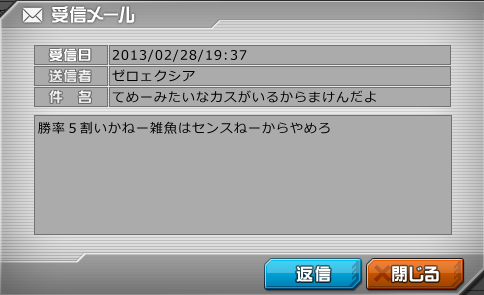 君夢も所属していた08小隊に所属していたプレイヤー (2013/12/10頃に脱退した模様。脱退理由は部隊内でほとんど会話がなく、部隊長に意思疎通する気なしと判断され追放されたらしい。) オープンβからプレイを続けている有名な糞指揮 指揮について文句を言うと、「クズ、ゴミ、ROMってろ」など、根拠のないレッテル貼り付けや陰口を言い、非常に香ばしい また、文句を言ったプレイヤーを見つけると大規模戦が始まってから終わるまでずっとビームサーベルで切り続ける 個チャやメールでは暴言や陰口が酷いが、表向きは良い人間を演じようとしており、面子を保とうとするために平気で嘘を付くがその嘘はバレバレである。 ガンオンについても「アカウントは知り合いに渡した」と言っているが、実際は渡しておらずプレイを続けている。 かつて勝利寸前に入るなどして稼いだ指揮勝率は7割を超えていたが、最新の戦闘記録を見るとおよそ5割まで下がっている。 画像アップローダや2chにおいても時々話題になる事があるが、彼を知るプレイヤーからは「本物のガイジ」「触ってはいけないプレイヤー」という認識をされているためあまり盛り上がらない。