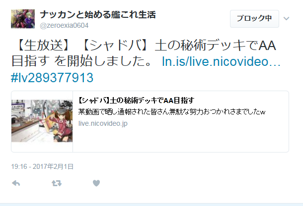 なお12月2日前後にアカウントを削除している。 削除直前に「しばらくネットから離れた方がいいかもしれない」と呟いているが、ニコ生では相変わらず生放送を続けている。