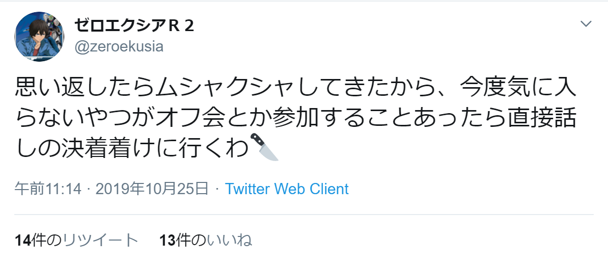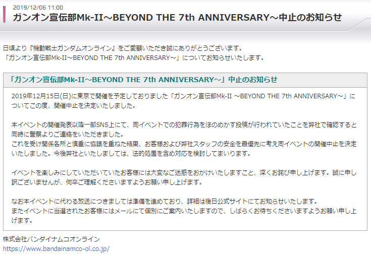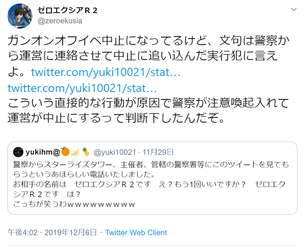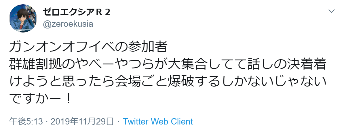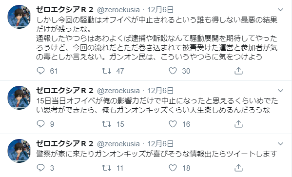 2019年12月06日、運営が犯罪をほのめかす投稿を確認したと同時に警察から連絡を受け取ったとして2019年12月15日に予定していた オフラインイベント(ガンオン宣伝部Mk-II〜BEYOND THE 7th ANNIVERSARY〜)の中止を発表。 https://msgo.bandainamco-ol.jp/member/information/article.php?no=2604&tag=Important キタノなりすましによるアカウントBAN後もツイッターにて淡々とヘイトを集める呟きを続けていたゼロエクシアだが 犯罪をほのめかす呟きをした張本人として話題となった。 事の発端はイベント中止発表の1か月半前に投稿された呟きによるものだった。 10月の呟きの時点ではまだ公式によるオフイベ開催決定のお知らせはきていなかったのだが、 一部のツイッターユーザーの中で「改めてこいつヤベー奴だな」、「第二のD格事件か?」などの書き込みが見られた。 しかし、その3日後、なんと公式生放送で運営がオフイベの開催を発表したのである。タイミング最悪 これを聞きつけた一部ツイッターユーザーは例のツイートを掘り起こし本人を煽り立てるように拡散。 だが恐らく本人も引くに引けなくなったのかツイートの削除や発言の撤回は行わなかった。 この呟きの時点で通報されてもおかしくないはずなのだが、 何を思ったのか今度はその1か月後に直接オフイベの名前を出した爆破予告とも受け取れるような呟きを投稿してしまう。(馬鹿なのだろうか) その約1時間後にはあるガンオンプレイヤーが流石にそろそろ危ないのではないのかと感じ、警察に通報している。 通報の際相手の名前を聞かれたが、本名がわからないため、仕方なく彼のユーザーネームである「ゼロエクシアR2」というクッソダサい名前を警察を前にして口に出して伝える羽目となってしまった。 その後も警察と彼のツイートを一緒に見ていったそうで二人して笑っていたとかなんとか。 一応通報した当日には警察に実害ありと判断されていたのだが、しばらくの間は特に運営からの報告もなくメンテナンスも通常通り行われていた。 もちろんその間もじわじわとツイートは伸び続け、多くのユーザーに彼の存在が知れ渡り始めていた。 そしてその丁度1週間後、運営によってイベントの中止が発表され事態は急展開を迎えた。 お知らせを見たユーザーの反応はまちまちであり、純粋にイベント中止を悲しむ者もいれば面白がって悪乗りをする者もいた。 過去にいくつか事件を起こしていることもあってか、複数のまとめサイトなどで記事を作成されてしまい、悪い意味で話題となってしまった。 (現在「ガンダムオンライン イベント中止」で検索すれば実際にまとめられている記事を見ることが可能) 本人は用事があったのか寝ていたのか中止が発表されてから約5時間後にようやく騒動に気づき呟きを投稿した。 その呟きがこちら 通報した人(彼によれば実行犯)が悪い、そいつが通報したせいで中止になったんだから文句は通報した奴に言ってくれとのこと。 どうしたらこのような考え方に行き着くのか不思議でしょうがない。 ここで普通なら発言の撤回やらをして誤解を招くような発言してしまったことお詫びするべきなのだが、プライドが高いのか単純に頭が悪すぎるのか彼は一切自分の非を認めるような呟きはしなかった。 その後も強気な呟きをしたり、自分のせいであるにもかかわらず参加者が可哀そうだなどというわけのわからないツイートをしている。(何を考えているのか全く理解できないため解説することを断念) ツイートを見る限り、恐らく本人はこんなことで逮捕されるわけがないと思っているのだろうが、 自分ではネタや冗談のつもりであっても「人や建物に危害を加えるつもりだ」といった暴力的な表現を用いて業務を妨害すれば、威力業務妨害罪という立派な犯罪となる。 それも今回のはユーザー同士で自主的に開催したオフイベなどではなく、運営が企画した公式的なオフイベである。 もちろんイベントの会場費のキャンセル代や外注した業者のキャンセル代、企画・準備をしたの社員の給料、企業のイメージ悪化等々実際に金額面も含めた被害が及んでいるため損害賠償を請求される可能性が高い。 おまけに運営のお知らせには法的処置を含めた対応を検討しているとの記載もあり、このままお咎めなしに終わるとは到底思えない。 また、現在12/8時点では12/6から本人のツイッターの更新は止まっており、何かしらあったのではないかと思われる。(親に連絡がいった・警察に身を拘束された・PCを押収されたなど)