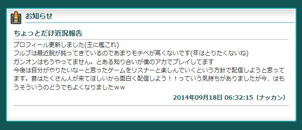 ニコ生の配信コミュニティはこちら 最近は声真似コミュで直結をするのが趣味なようだ 以前は頻繁にEXVSの配信をしていたが、フルブーストが発売されてからは何故か一切配信をしていない(ガンオンの配信はしている)