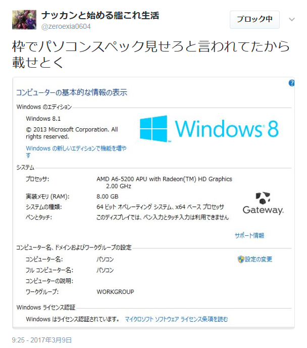 ……と思いきや、ゼロエクシアのPCはノートPCではなく、Gatewayから発売されたタワー型PC、DX4375-F48F/Gである可能性が高い事が判明する。 http://kakaku.com/item/K0000675914/spec/ メモリ、CPU、周波数、メーカーと大部分が一致しているためこのパソコンを使っている可能性が高い。 正確な価格は不明だが、2ちゃんねるのGatewayスレによると47990円、価格.comの当時の購入者によると税込み60000円で購入できた、とのこと。 現在中古では27000円前後で取引されているようである。 わざわざこのようなゴミPCに5万円払ったゼロエクシアもゼロエクシアであるが、 モバイル用CPUをタワーケースに積んで販売しているGatewayも一体何を考えているんだ、と言わざるを得ない。 ちなみにこのPCの発売日は2013/12/20であり、(少なくともツイッターの呟きを見る限りは)ゼロエクシアがまだまともに仕事をしていた時期に発売したパソコンである。 仕事をしていたのなら何故このような格安パソコンを選んでしまったのか……? 定職に就いていればパソコンに金をかけるのはそれ程難しいことではないし、8万円も出せばこれよりも2回りは性能の良いパソコンを購入できたはずである。