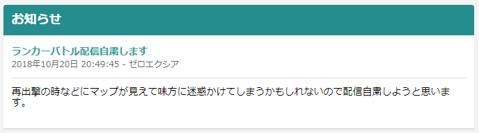 2015年12月現在のゼロエクシアである。 何故かロケシュ持ちのアレックスにBZを装備させておらず、「心優しき指揮官」という嘘800の称号を付けている。 http://www.nicovideo.jp/watch/sm30525081 この動画で放置マクロを晒された後のゼロエクシアの発言である。 結局、トーナメント中に発言した暴言に対する謝罪、これからは真面目にプレイをする、といった発言は全て嘘だったということだろう。 BANは逃れたのかもしれないが、ゼロエクシアには他のプレイヤーからの信頼を失うことには何の抵抗も無いのだろうか? この結果、初動キックの扇動が増えても自業自得としか言えないのだが……。 また、動画に対してわざわざ反応していることから既に何らかの実害を受けている可能性もある。(キックが増えた、運営から警告メールがきた、など。) 何も無ければわざわざ晒しに反応したりはしないだろう。