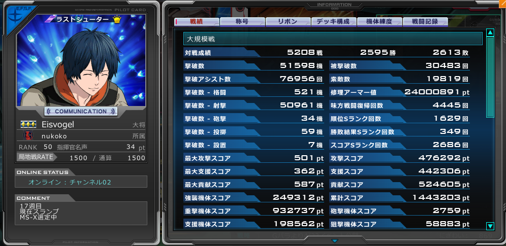 MS戦におけるキル能力だけを身に着けた芋。 上の写真の参戦数の時点で、総本拠点ダメージはわずか約85万という大将にあるまじき超低ダメージである。 一応、キルを取る能力だけはあるため、何も仕事をしないのに比べればマシではある。 本人が度々ロビーにて「勝てない」等々、勝敗に関する事に不満をよく漏らしているが、このプレイスタイルはMS戦をメインに置くKD戦ならいいが、本拠点を殴る目があるマップでは地雷プレイヤーでしかない。 なお、それを指摘されると自分のプレイスタイルを否定されるからか、様々な言い訳をして反論する。 また、これで正論を言われて反論されると、その後ネガネガとロビーチャットにて不満を垂れ流するというネガティブ思考の人物でもある。